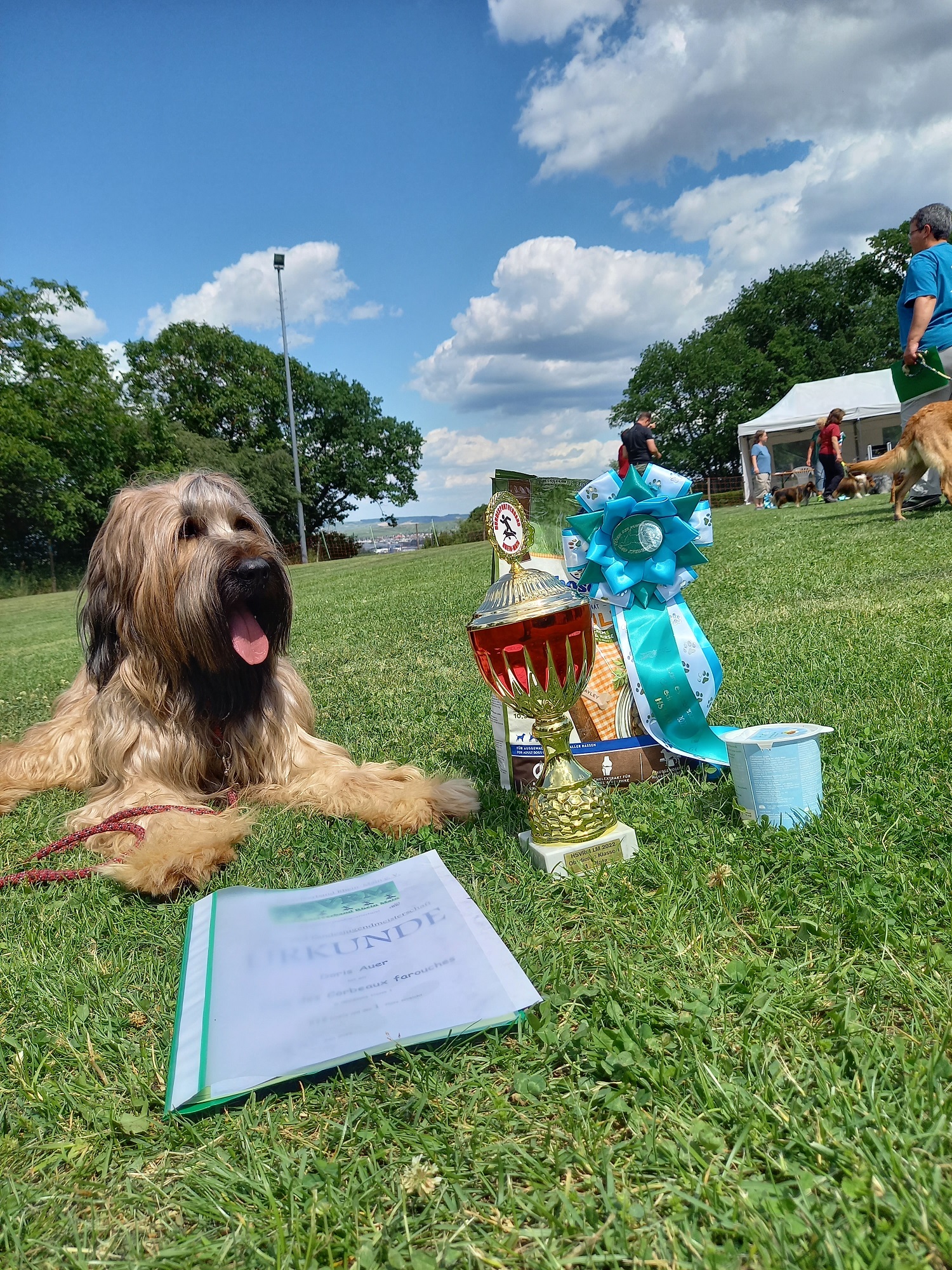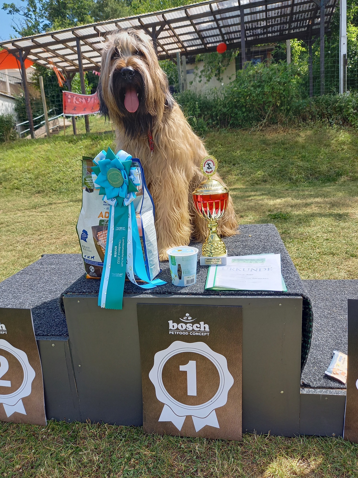 Es fing super an: Abrufen 9 Punkte, Distanzkontrolle 10 Punkte, Platz aus der Bewegung 10 Punkte. Fürs Apportieren gab es nur 5 Punkte, da Zora meinte sie müsste 3 mal über die Hürde springen. Für die Fußarbeit gab es 7,5 Punkte. Bis dahin war alles klasse. Dann wollte sie leider nicht in die Box, eine 0. Die Pylonengruppe als letzte Übung war nochmal eine 10! Die Gruppenübung lief super mit 9,5 Punkten und so waren wir mit 240,5 Punkten tatsächlich die Besten in der Klasse 1 an diesem Tag und damit Obedience Landesmeister vom HSVRM. Das hätte ich vorher ja nie für möglich gehalten.